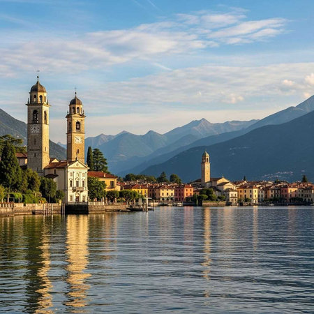 View of the city of Ascona, Switzerland. Lake and mountain views, boats. Sunny day. Beautiful landscape