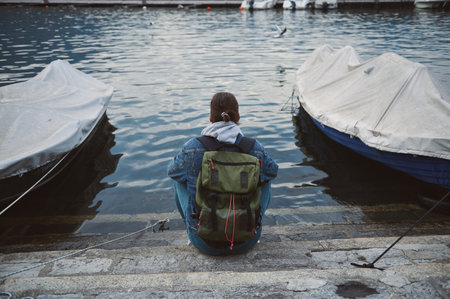 A person with a backpack sitting on stone steps at a dock between two covered boats overlooking a calm water body, reflecting peace and solitude.