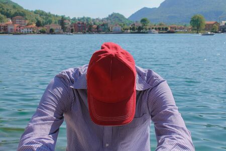 Man in cap relaxing against lake and mountains