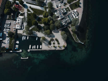 Aerial view from the drone of the landscape of a small town on the shores of lake Como, Italy.
