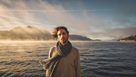 Outdoor portrait of beautiful young woman relaxing by mountain lake, cold weather