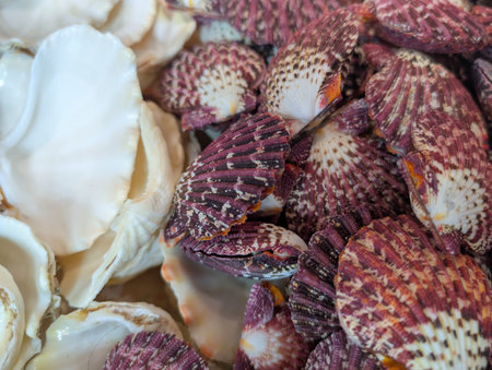 Fresh Pilgrim scallops or Pecten jacobaeus shell in market