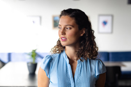 Smiling young biracial female advisor with black hair looking away against blue wall. unaltered, business, people and emotions concept.