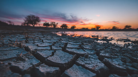 Captivating view of dry cracked earth illuminated by warm sunlight at dusk. This image highlights textures and environmental concerns related to climate change.