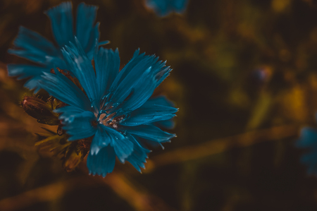 Blue cornflower in the wild. Close up with postcard processing.