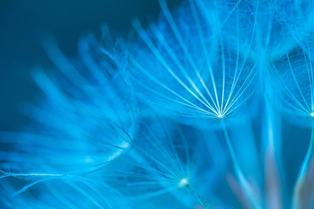 Beautiful dew drops on a dandelion seed macro. Beautiful soft blue background. Water drops on a parachutes dandelion. Copy space. soft focus on water droplets. circular shape, abstract background.