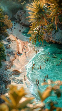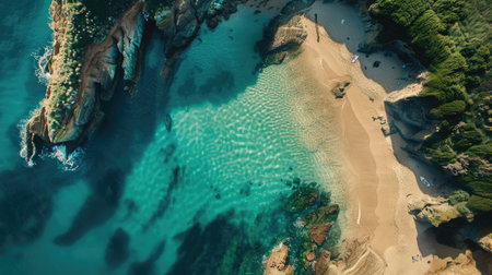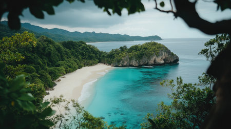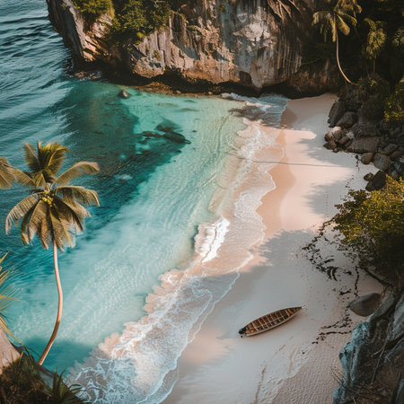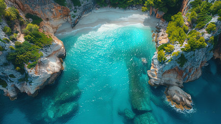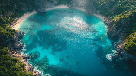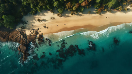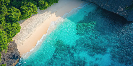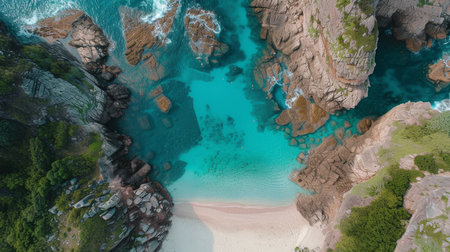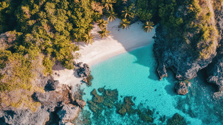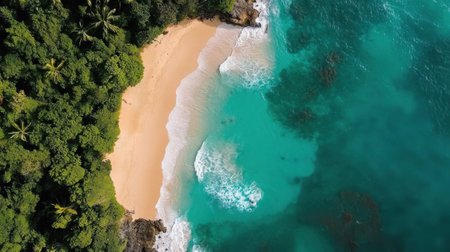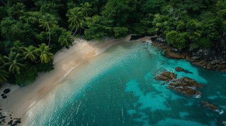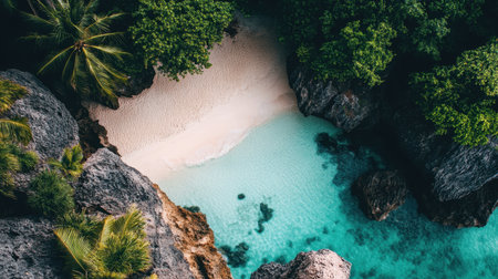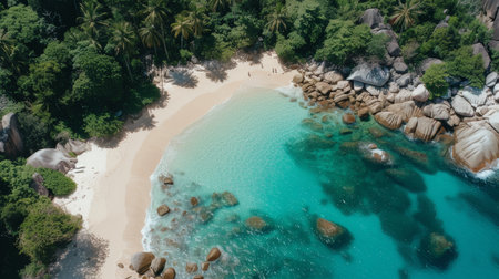 From above, a secluded beach unfolds in breathtaking beauty Pristine turquoise waters lap the shore, fringed by lush, emerald foliage The air hangs heavy with the scent of tropical flowers, painting a serene picture of paradise This is a place where time stands still, offering sanctuary and tranquility AI Generative