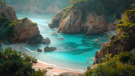 AI Generated. Breathtaking view of coastal cliffs with turquoise water and hidden beach