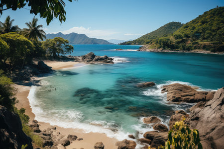 AI Generated. Tranquil Tropical Beach Cove with Crystal Clear Water and Lush Green Hills
