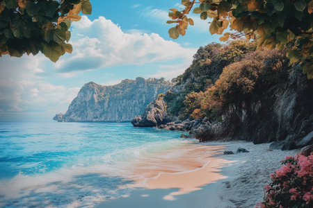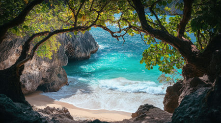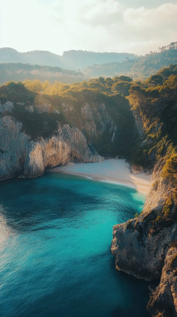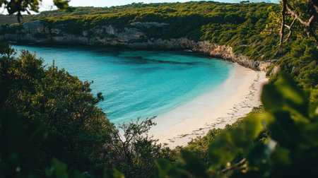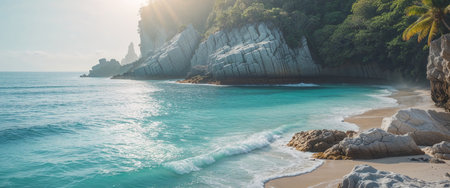 Anuched untouched beach emerges from vibrant blue waters, framed by cliffs and dense vegetation. The sunlight highlights the natural beauty of this tranquil paradise.