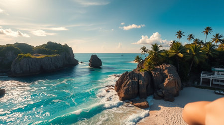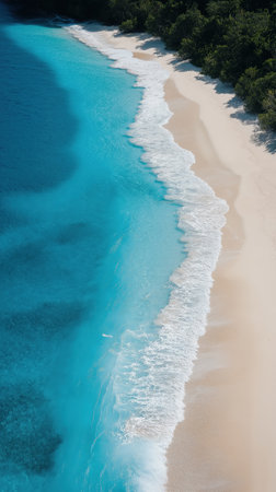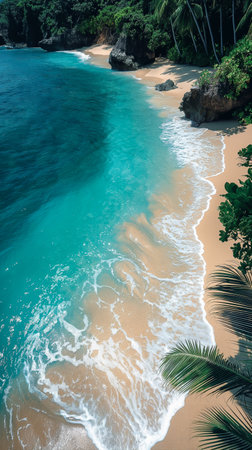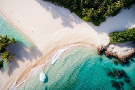 An aerial view of a tranquil tropical beach featuring fine sand, turquoise waters, and lush palm trees. This serene paradise invites relaxation and adventure.