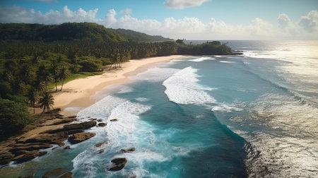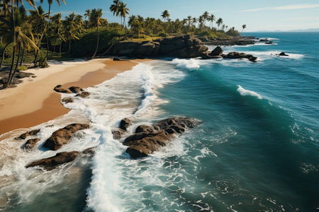 A tranquil scene of a tropical coastline, waves crashing on rocks generated by artificial intelligence