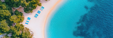 A breathtaking aerial view captures a tranquil tropical beach with inviting lounge chairs and crystal-clear turquoise waters, perfect for relaxation.