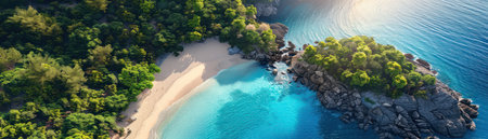 An aerial view of a secluded tropical beach featuring soft sand, lush greenery, and clear blue waters. Perfect for portraying relaxation and serenity.