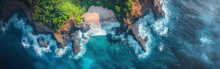 Summer seascape from above, showcasing a dramatic rocky shoreline and clear ocean water, great for travel brochures or beach-themed imagery.