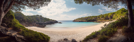 Cala Turqueta beach in Menorca offers a tranquil escape with its soft white sands and crystal-clear turquoise waters, surrounded by vibrant greenery and natural beauty.