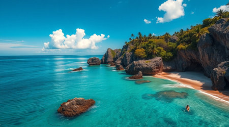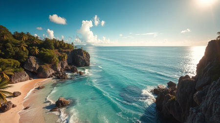AI Generated. Tropical Ocean Coast with Clear Blue Water and Rocky Cliffs