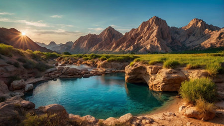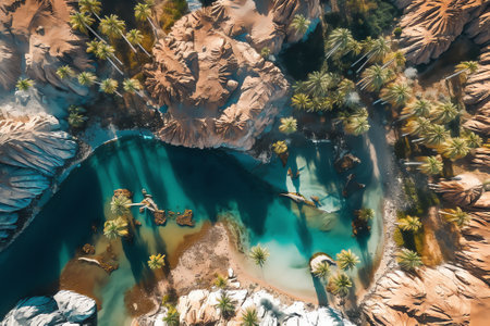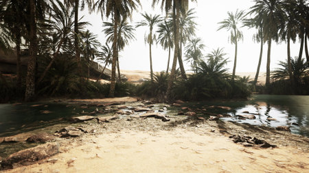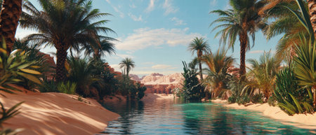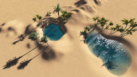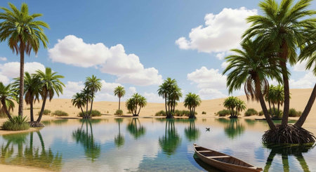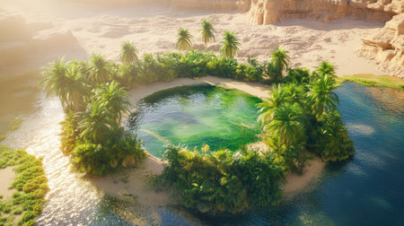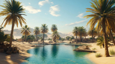 Nestled amidst vast golden sands, a serene oasis beckons with lush palm trees and tranquil waters. This hidden gem shines brightly under the warm sun, celebrating natures beauty.