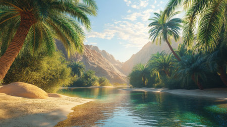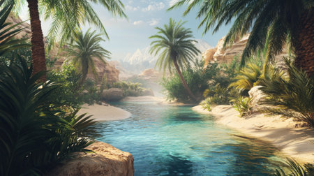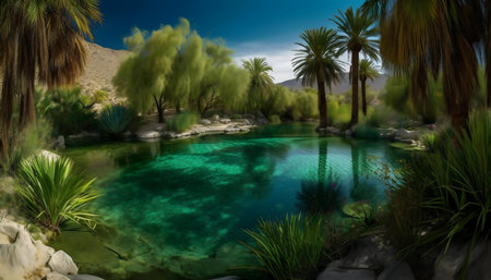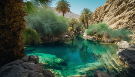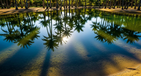 A serene oasis lies quietly among lush palm trees, reflecting tranquility in the clear water. The warm sun casts gentle shadows, creating a peaceful retreat in natures embrace.