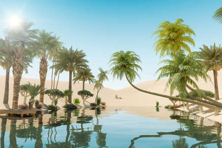 Oasis in the desert. Panorama. 3d rendering