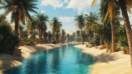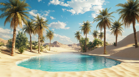 A serene desert oasis with clear blue water, surrounded by swaying palm trees and golden sand dunes, under a bright sunny sky, tranquil and inspiring.