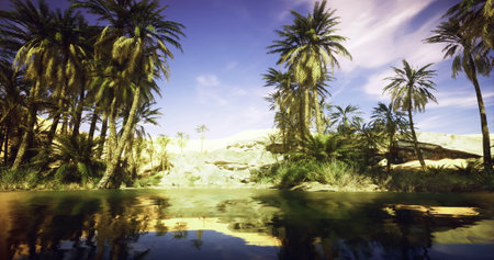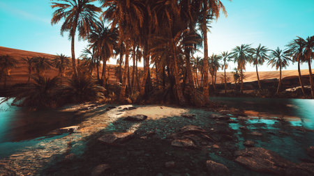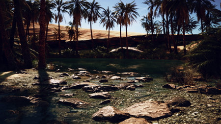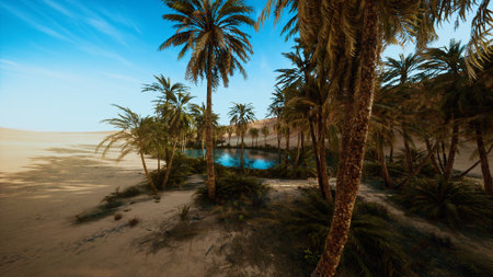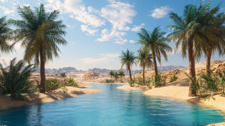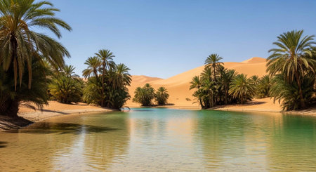 A tranquil oasis is nestled among lush palm trees, offering solace amidst the expansive golden sands of the desert. Clear waters reflect the bright sky, creating a peaceful haven.