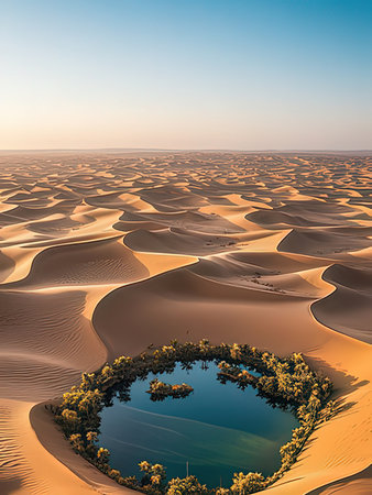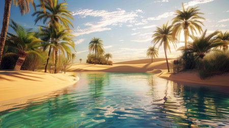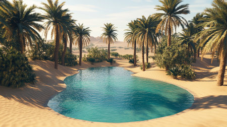 A tranquil oasis surrounded by lush palm trees sits peacefully amid expansive sand dunes. The still water reflects the vibrant greenery under the suns warm glow, creating a serene escape.