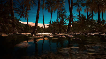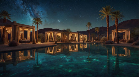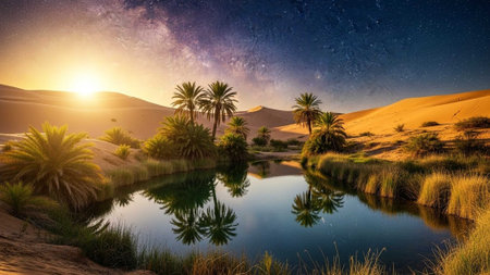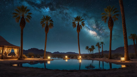 Palm trees sway gently by a shimmering oasis reflecting the starry night. Soft winds whisper through the desert as nature reveals its serene beauty, inviting peace and exploration.