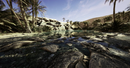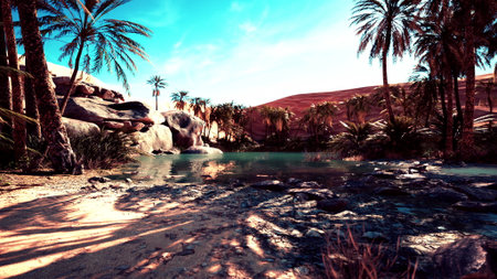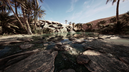 A serene oasis showcases lush palm trees reflecting in clear water surrounded by smooth stones. The sun casts gentle light onto the vibrant scene amidst a vast desert landscape.
