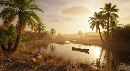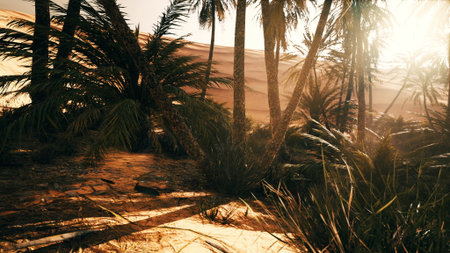 Golden sunlight filters through tall palm trees in a vibrant oasis. The warm glow highlights the lush greenery surrounded by sandy dunes, creating a peaceful and tranquil atmosphere.