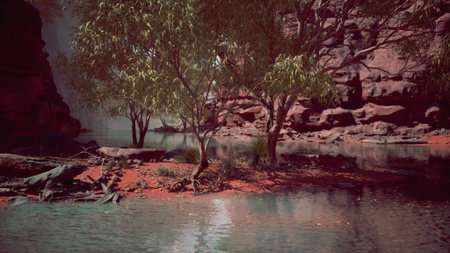 Desert landscape with a river and palm trees. 3d rendering