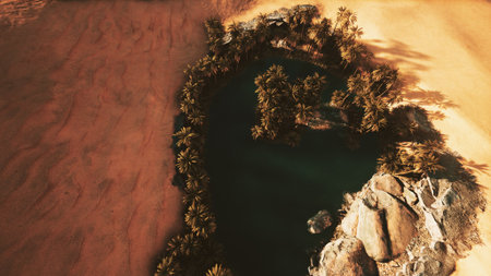 Oasis in the desert with palm trees and lake in the middle
