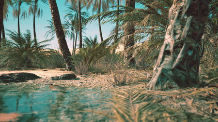 In a tranquil oasis, vibrant palm trees tower over a clear pool of water. The sun illuminates the scene, casting shimmering reflections. Nature's beauty flourishes in this serene paradise.