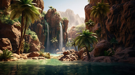 Waterfall in the desert with palm trees and shrubs - 3d render