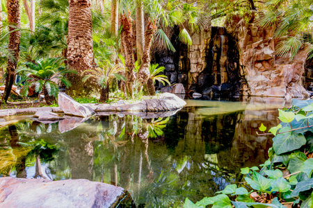 Beautiful view of tropical park pond with palm trees rocks and waterfall reflected in calm water. Las Vegas. USA.