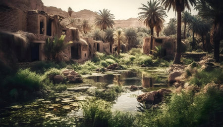 Serene view of an ancient, abandoned village nestled in a desert oasis.
