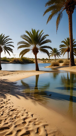 A peaceful oasis is nestled among tall palm trees, reflecting the bright blue sky and golden sands of the arid desert. Sunlight bathes the area in a warm glow, creating a tranquil escape.