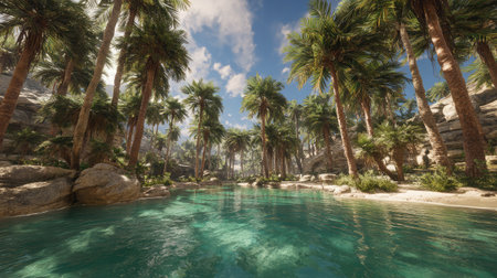 Lush palm trees surround a serene oasis, with clear turquoise waters reflecting the sunlight. Soft sand and rocky shore create a peaceful retreat in a desert landscape.