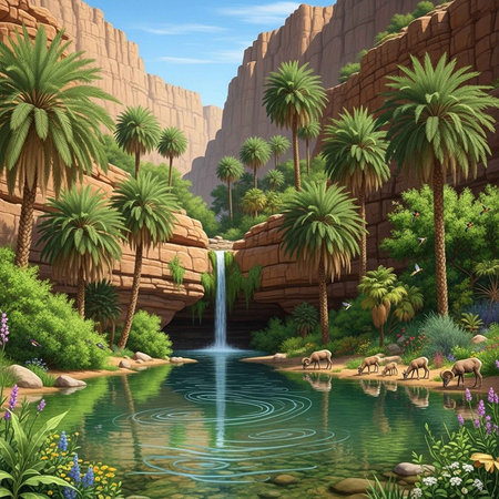 An enchanting oasis emerges amidst the golden sands, featuring lush palm trees and crystal clear waters. This tranquil spot offers a vibrant contrast in the arid landscape, inviting exploration.
