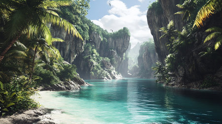 Fantasy landscape with palm trees and turquoise water. 3d rendering