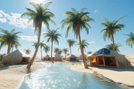 Luxurious tents are set up by a stream, surrounded by palm trees under a bright blue sky in the desert.