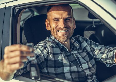 A male driver stands near a car with a key in his hand and smiles.