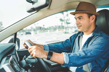 A young Asian man drives a car on a clear day. With beautiful blue sky. He driving to travel by car.