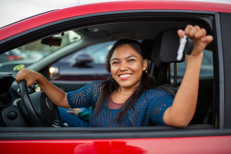 A cheerful woman sitting in the driver's seat of a red car, holding up car keys and smiling