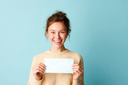 Cheerful Young Woman Holding a Blank Check