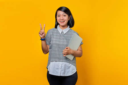 Cheerful beautiful Asian woman holding laptop and showing peace sign over yellow background