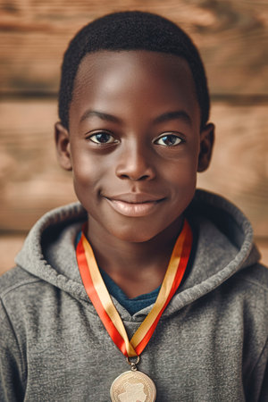 Little African American boy receiving a sports medal portrait. Vertical image