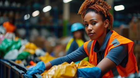 Worker sorts trash on conveyor belt at waste recycling plant
