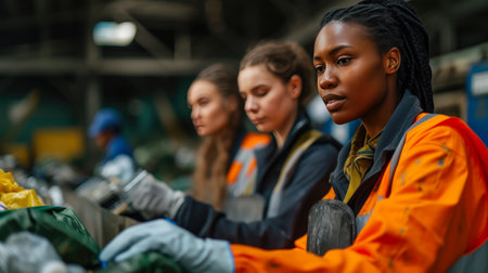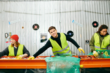 Young volunteers in gloves and safety vests collaborated to sort trash on a table.