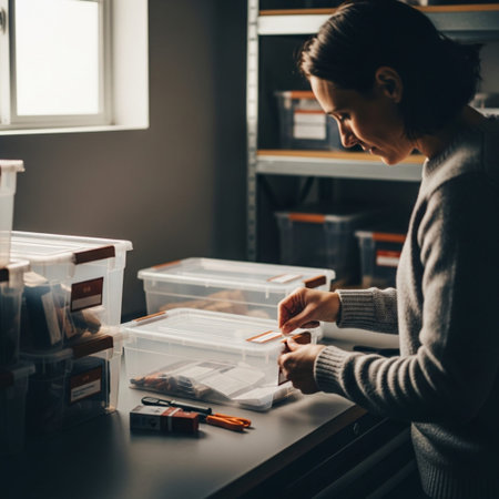 High angle view of craftsman looking at tile pieces in boxes of storage space in mosaic workshop, copy space